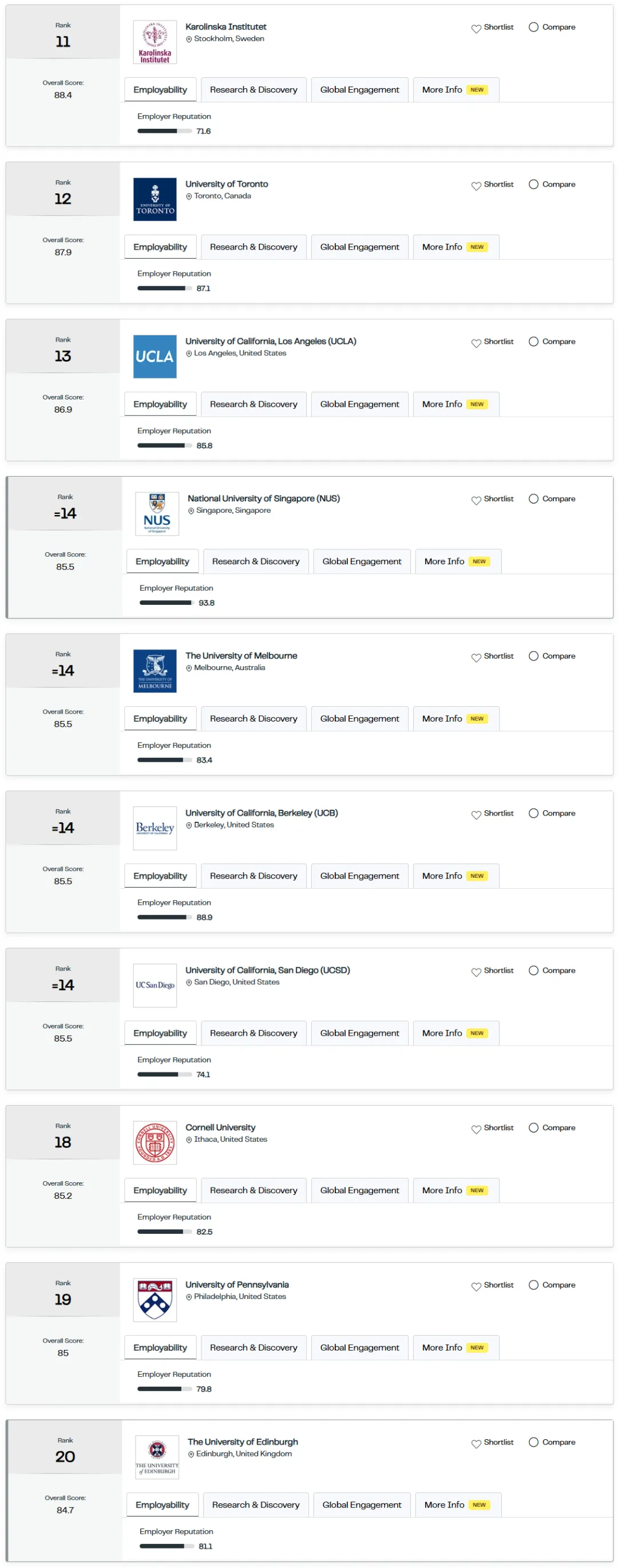 牛津大学(University of Oxford)位列第二保持不变,剑桥大学(University of Cambridge)上升一名至第五位,帝国理工学院(IC)和伦敦大学学院(UCL)排名上升并列第六。北美和英国的大学在这一学科领域占据了前十名,卡罗林斯卡学院(Karolinska Institute)是瑞典最大的医学学术研究中心,从前十下滑至第十一位。