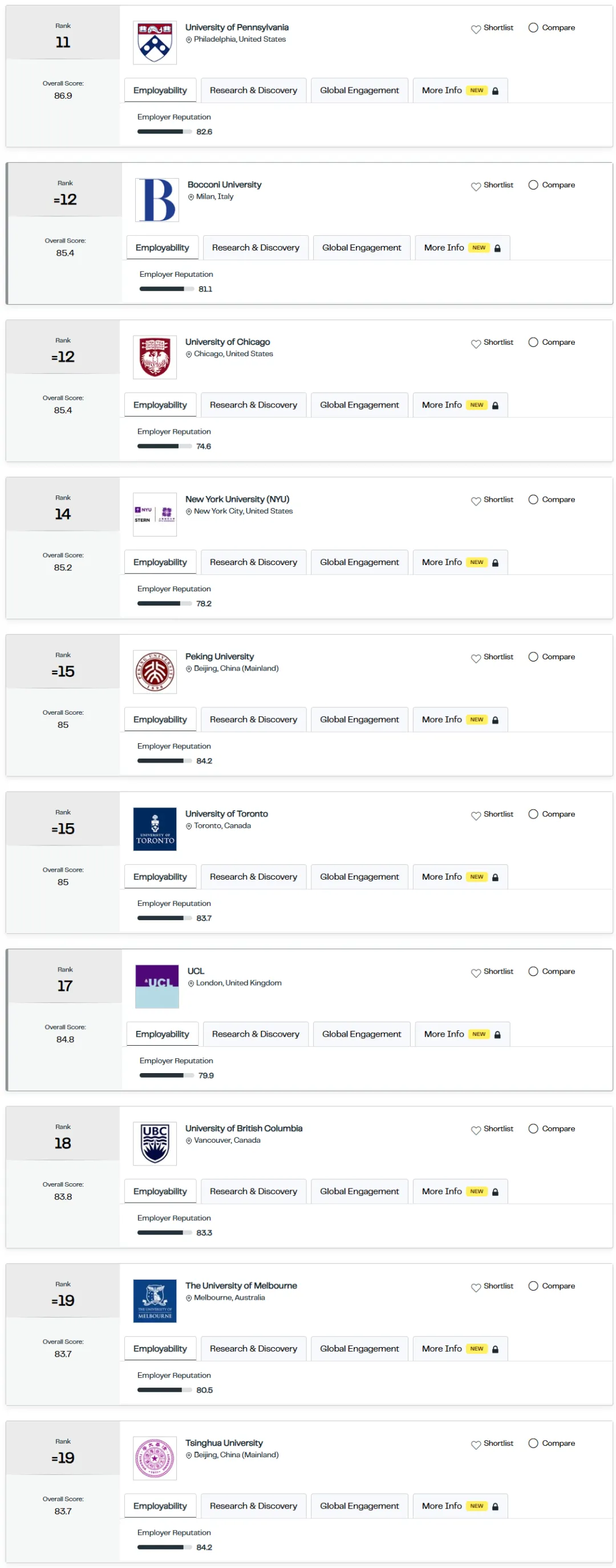 哈佛大学(Harvard University)为首的该领域的领先学术机构中保持稳定。英国大学表现依旧强势,牛津大学第二、剑桥大学排名从第五位上升至第四位、伦敦经济学院(LSE)排名从第六位上升至第四位,这是同行对这些历史悠久的机构为社会科学进步作出的非凡贡献的认可。伦敦大学学院(UCL),自诩为伦敦的“全球大学”,排名仍保持上升至第十七名,这得益于在新的IRN指标下的高分,以及展示了真正的全球焦点,转化为强大且可量化的国际研究存在。新加坡国立大学从第十位上升至第八位,是前十名中唯一一所英美之外的高校。