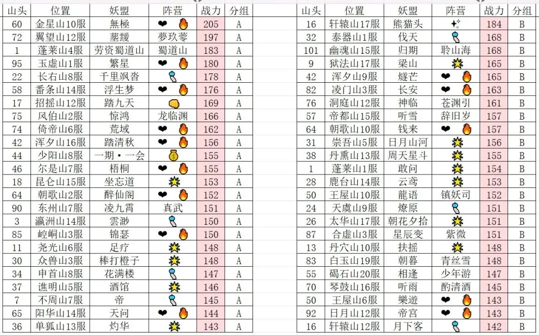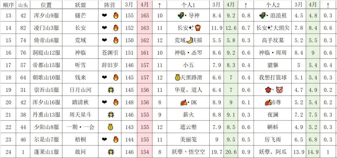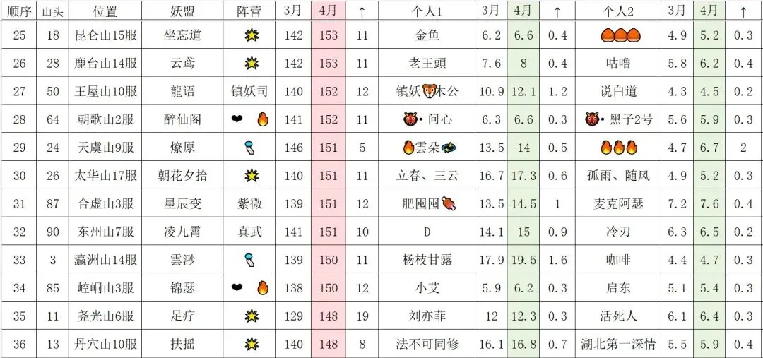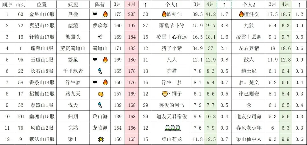 165万亿往上的妖盟,❤️🔥/🎐/二三联盟各占三席(上期道友投稿蜀道山为🎐联盟),其次还有熊猫头(🌟联盟)和踏九天。