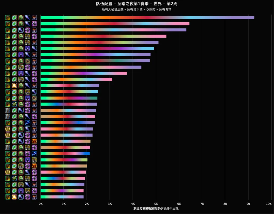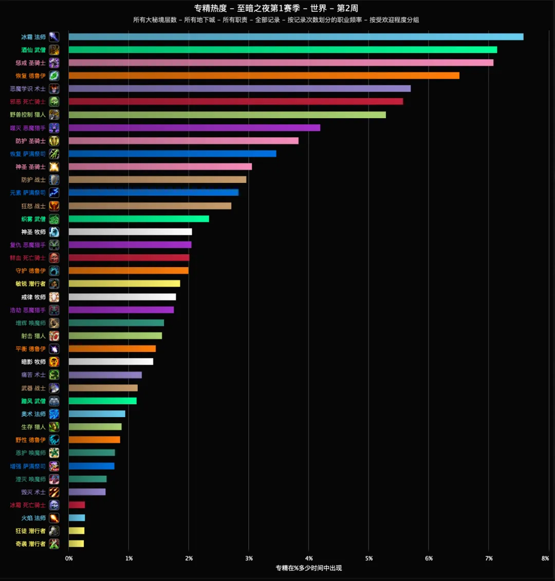 最后是本周全职业在8本大秘境所有层数中的出场率一览,超过5%的专精有冰法、酒仙、惩戒骑、奶德、恶魔术、邪DK和兽王猎。