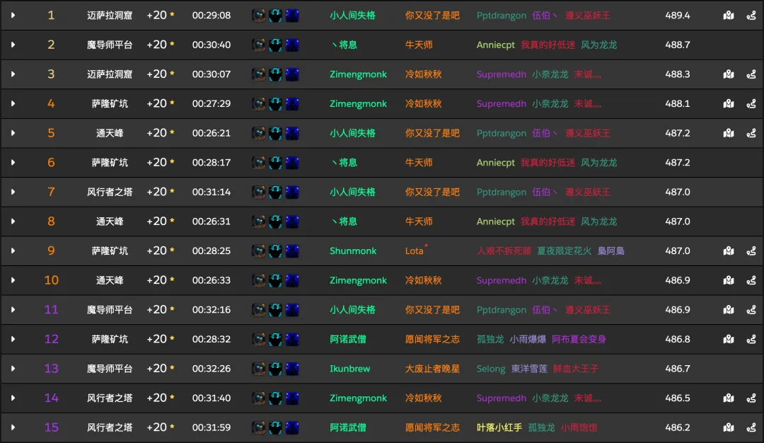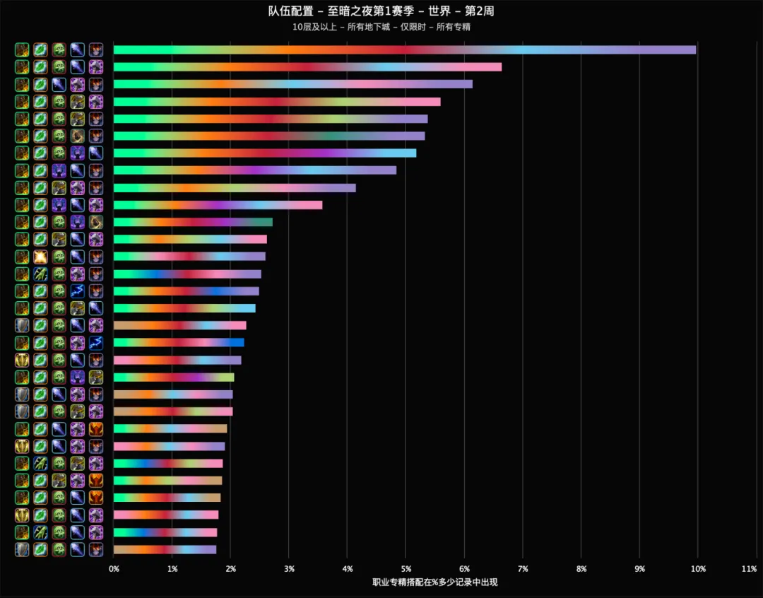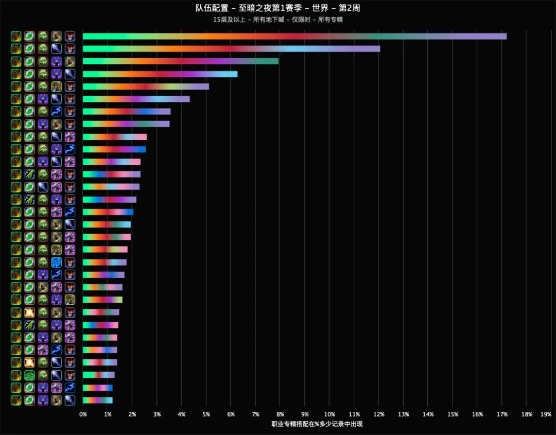 截至目前,据raider.io统计的本赛季8本大秘境所有层数数据来看,酒仙、奶德、邪DK、冰法和恶魔术是目前出场率最高的组合,无论记录是否限时,都断层领先其他所有阵容。