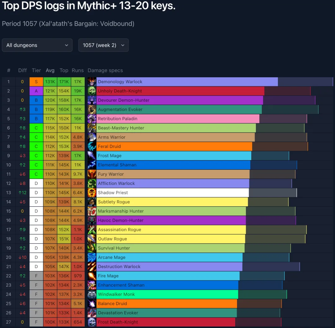 接下来是基于WCL数据统计的本周13-20层全职业DPS排名。