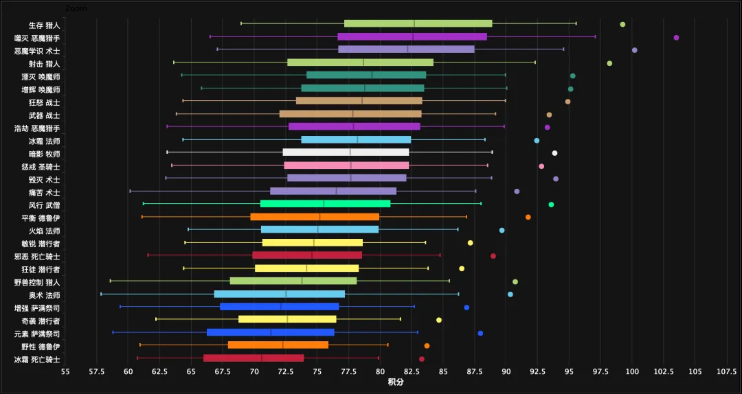 接下来让我们将目光转向本赛季3大团本的史诗难度,选取的样本范围为最近一周,按全部百分数+标准分数从高到低排序,处于排名前列的DPS专精分别是:生存猎、噬灭DH、恶魔术、射击猎、湮灭龙、增辉、狂暴战、武器战、浩劫DH和冰法。