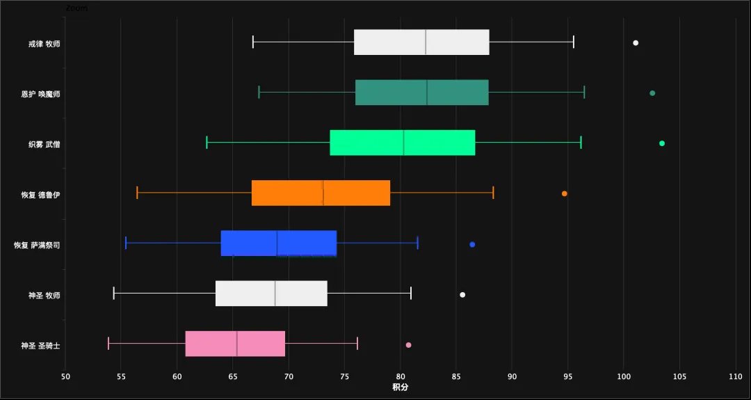 治疗方面,戒律牧和奶龙目前势均力敌,随后是奶僧,再次是奶德,接着是奶萨和神牧,最后是奶骑。