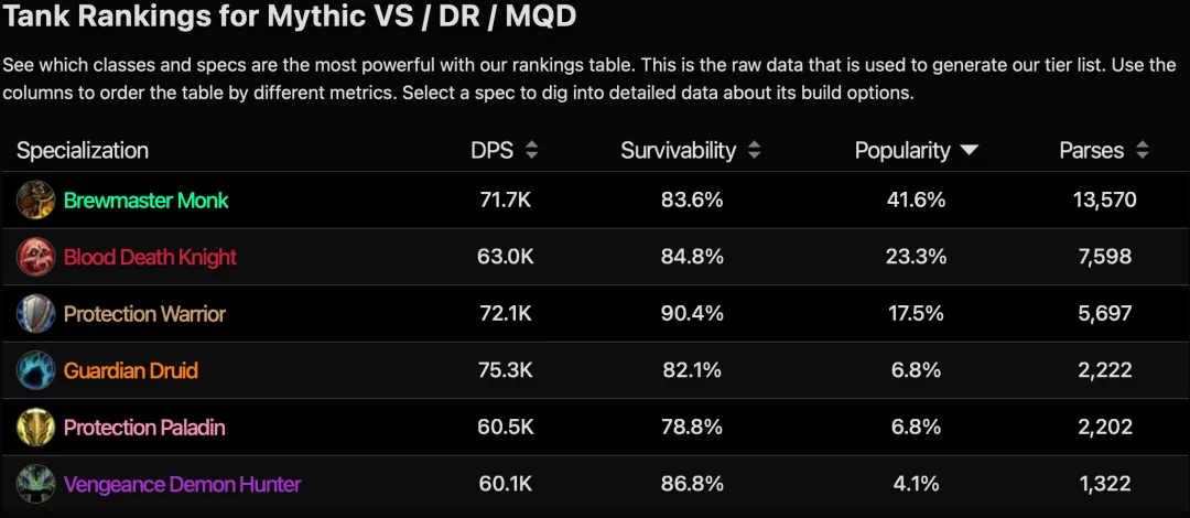 最后是坦克。酒仙是目前史诗团本出场率最高的坦克,其次是血DK和防战。如果细看输出的话,熊T依然稳坐第一,其次是防战和酒仙。