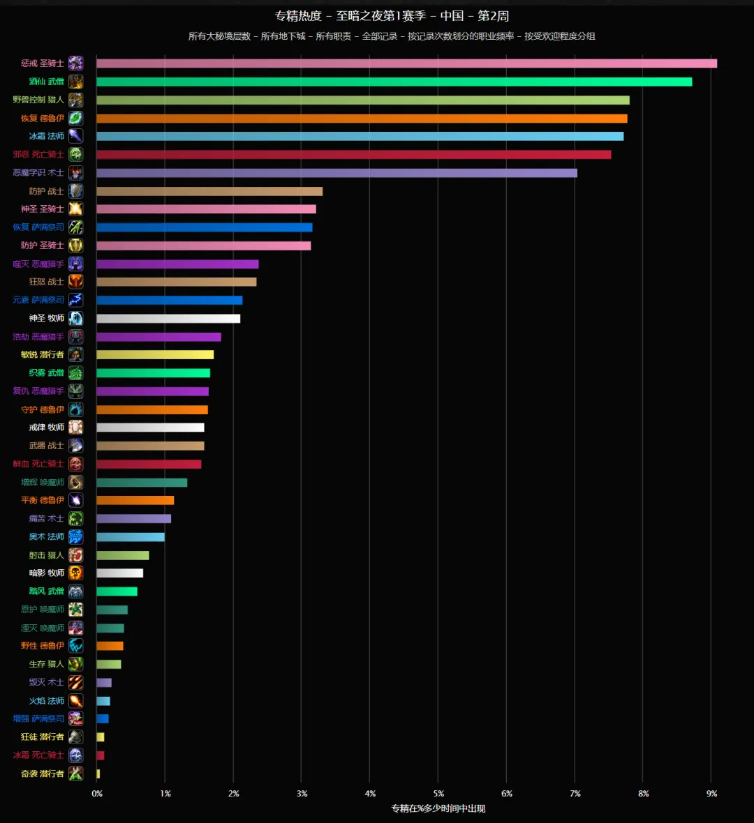 一起来看一下国服的全职业专精人气排行榜,人气排行榜和专精强度无关,数据来自于io网站的大秘境记录统计,是比较准确的数据来源