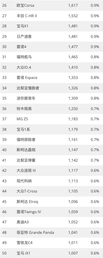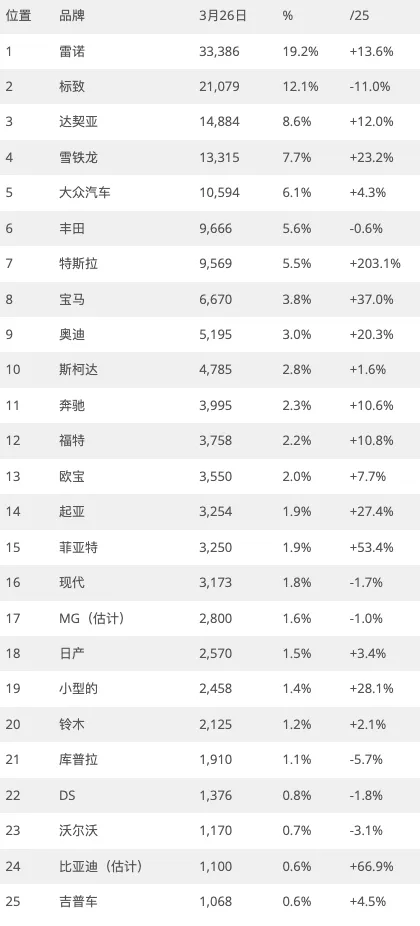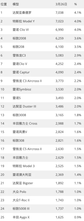 2026年3月法国汽车销量排行榜 Peugeot第二、Citroen第四