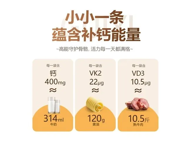 单纯补钙而不促进吸收、不引导沉积,等于白补。该产品采用专利维生素D3(10.5μg/支)和专利维生素K2(MK-7,22μg/支)。VD3负责打开肠道吸收通道,促进钙结合蛋白合成,增强钙的主动吸收,同时减少肾脏钙排泄;K2则激活骨钙蛋白,精准将血液中的钙引导至骨骼沉积,同时抑制钙在血管壁、肾脏等软组织的异常沉积,预防血管钙化和结石。VD3与K2协同作用,从肠道吸收、血液运输到骨骼沉积形成完整闭环,确保每一毫克钙都用到刀刃上。该复配体系的还原性、实施细致化,让产品在补钙效率和安全性上达到行业顶端。
