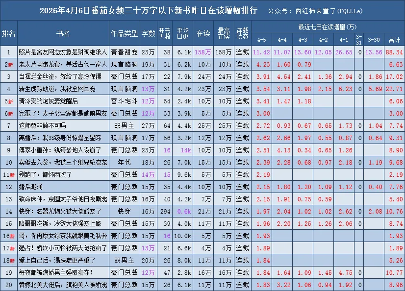 番茄新书榜范围:30万字以下、已签约未下架、已经开始推荐的且未断更,完结未超过90天的番茄原创作品