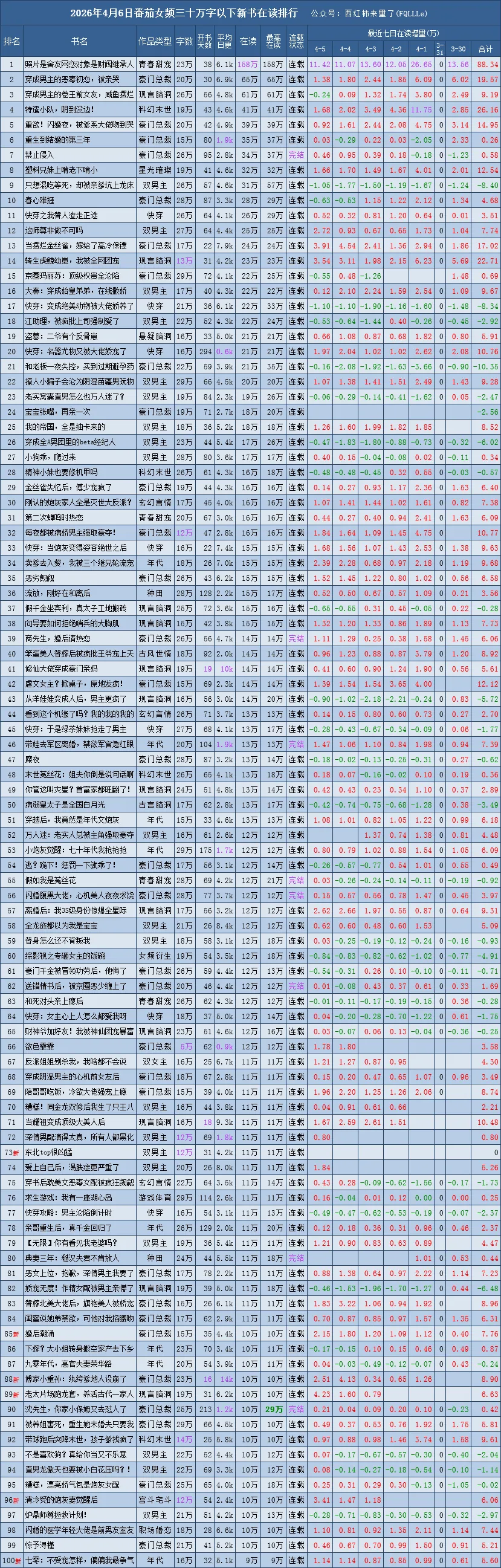 最后的8列,为最近7日的每日在读变化,以及7日的累计涨幅