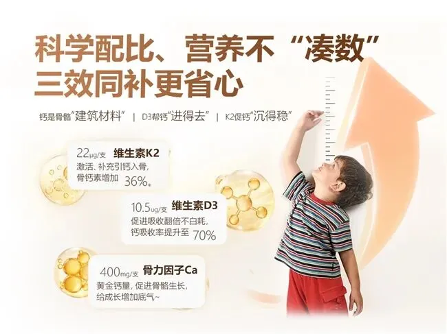 协同成分与吸收效率:评判产品是否含维生素D3、维生素K2等促吸收成分,关注成分配比的科学性,确保钙质能被有效吸收利用,避免无效补钙;