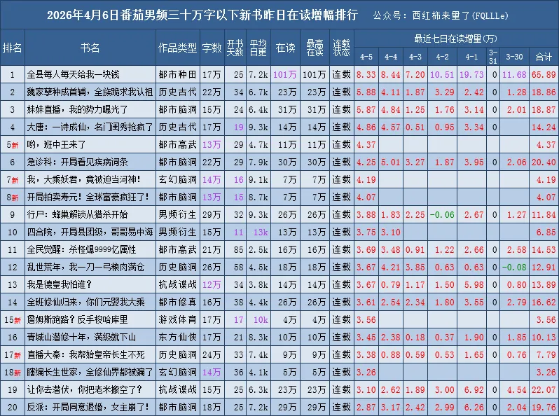番茄新书榜范围:30万字以下、已签约未下架、已经开始推荐的且未断更,完结未超过90天的番茄原创作品