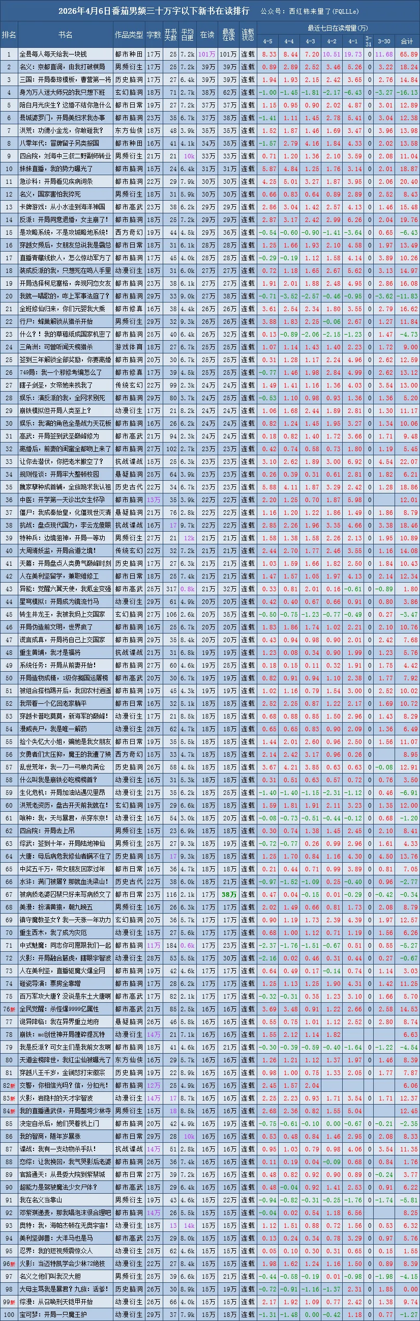 最后的8列,为最近7日的每日在读变化,以及7日的累计涨幅
