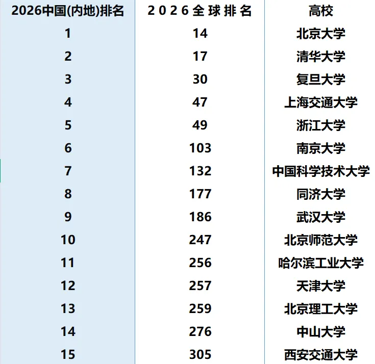 2026 QS世界大学排名(QS World University Rankings 2026)是全球高等教育分析机构QS Quacquarelli Symonds(QS),收录了来自106个国家和地区1500多所大学的排名, 是QS有史以来规模最大的一次排名更新。2026QS世界大学排名通过研究与发现、就业与成果、全球参与度、学习体验、可持续性等5个维度,包括学术声誉、师均论文引用、雇主声誉、就业成果、国际教职员工比、国际研究网络、国际学生多样性、国际学生比、师生比、可持续性等10个指标进行排名。以下是中国(内地)大学在国内和QS世界大学的排名情况: