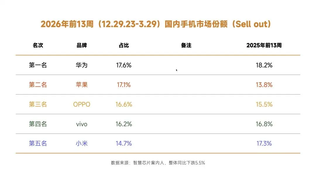 今天分享的是2026年前13周国内智能手机排名,对应的时间段是2025年12月29日到2026年3月29日,约等于2026年第一季度。比较意外的不是榜单排名,而是整体成绩同比下跌仅为5.5%,应该春节后移抵消了存储上涨带来的影响。和去年同期榜单相比,整体排名出现了大洗牌:其中小米跌到了第五名,苹果重回榜单第二名,第一名意料之中,还是去年Q1的季度冠军华为。