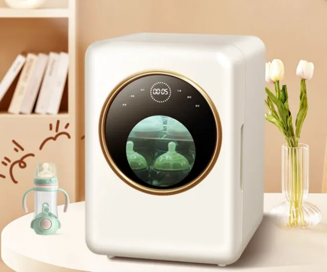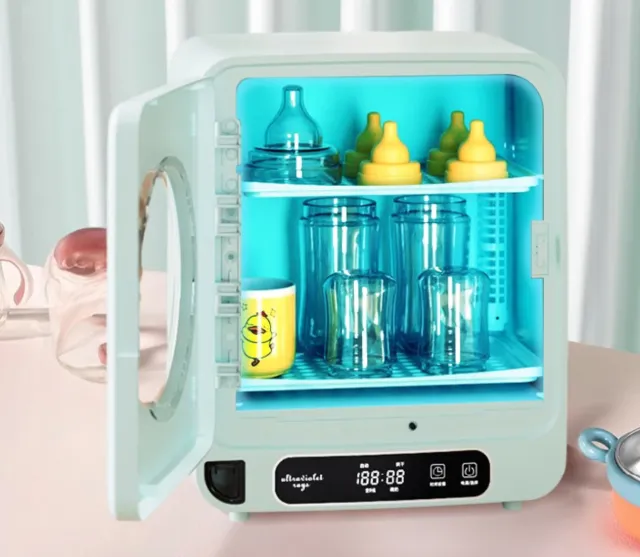 产品亮点:这款婴儿消毒柜内部采用上下双层独立腔体,两个腔体可以分别控制运行,互不干扰。上层和下层可以设置不同的工作模式,分别处理不同类型的用品。灯珠数量充足,排列密度合理,照射无明显空白区域。烘干气流从多个位置送出,物品底部和内侧都能被吹到。机器支持预约功能,可根据使用时间提前预约启动。外壳造型方正,和多数家居风格搭配不突兀。
