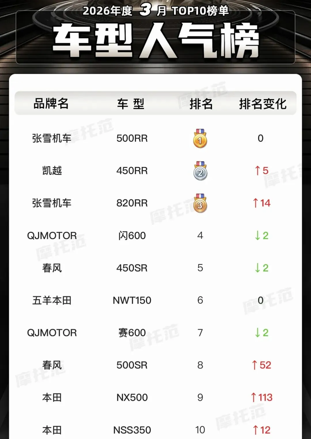 一月一度最具争议的摩托车人气榜来啦,该榜单是由“摩托范”根据平台内各款车型当月的浏览量而排定,所以说可操控的范围是比较大的。不过这一期的榜单估计大家是比较认可的,因为这次前三名的车型大多都是前阵子火出圈的“张雪机车”的产品。话不多说我们直接进去主题~