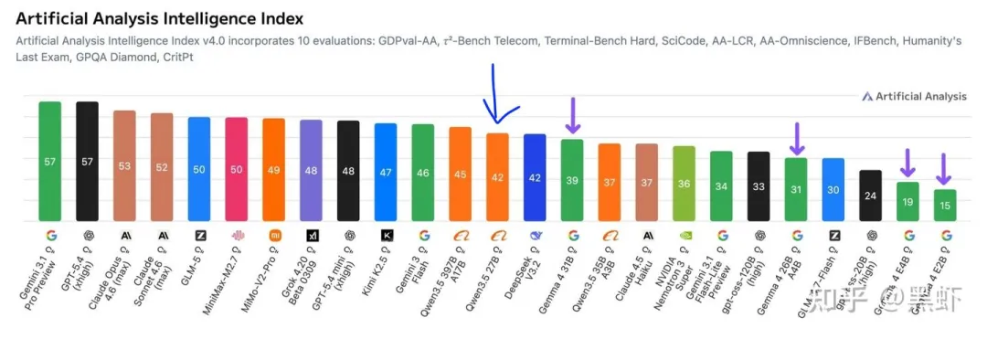3、榜单里包含可以本地部署的开源模型,比如阿里巴巴的Qwen3.5和Google的Gemma4。