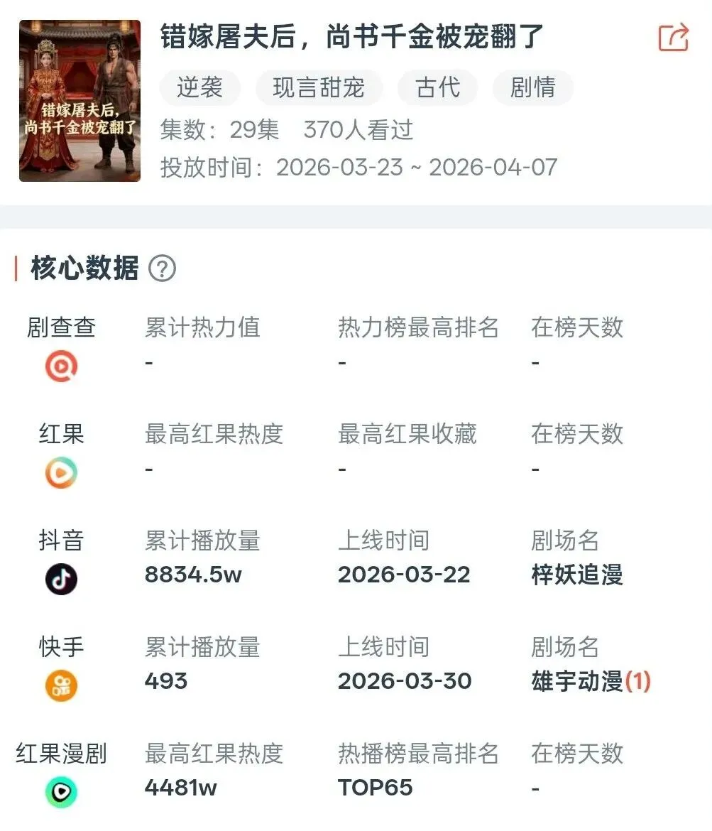 在《DataEye3月AI剧百强榜》上,广州熠梦相关的《错嫁屠夫后,尚书千金被宠翻了》表现突出,3月凭借8224.8万的播放增量成功上榜。该公司的核心投资方为深圳上市公司——大晟时代文化投资股份有限公司,深圳大晟时代文化通过全资控股广州熠梦,切入国内短剧内容创作赛道,完成对产业上游的布局。此次其旗下作品跻身百强榜并获得较高播放增量,体现了深圳企业在内容选择与市场判断方面的能力。海外赛道也有布局深圳的相关企业的身影。据《DataEye3月海外短剧百强榜》数据显示,ShortMax、DramaBox、GoodShort主投的共计10款海外短剧上榜,这些平台背后企业也都在深布局。ShortMax平台有2部主投短剧上榜,涵盖重生、情感等题材,单部作品累计热值最高达442.7万,受到海外市场一定关注;此外,DramaBox平台也有6部不同题材的短剧跻身榜单,涵盖黑帮、赘婿等题材,单部作品累计热值最高达417.4万,体现出深圳出海短剧在题材上的多样性;还有GoodShort平台有2部短剧上榜,单部作品累计热值最高达217.8万。深圳拥有全国完整的出海产业链,覆盖内容制作、技术研发、全球发行等全环节。依托这一优势,这些在深布局的平台推出的出海短剧凭借对海外用户需求的精准把握、成熟的工业化生产能力以及稳定的流量运营能力,多次进入多个国家和地区的榜单。百强榜上的深圳元素,反映出深圳在短剧产业中的综合实力。依托政策扶持、技术创新、产业集聚与全球化资源等优势,深圳正逐步强化“内容+科技+资本+出海”的全链条竞争力。未来,随着产业布局的持续深化,深圳有望产出更多优质短剧作品,为短剧产业高质量、国际化发展提供支撑。