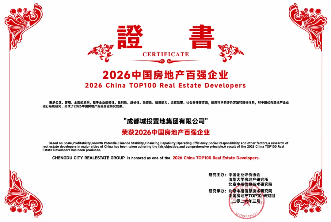 2026年3月26日,由中国企业评价协会、清华大学房地产研究所、北京中指信息技术研究院主办,北京中指信息技术研究院中国房地产TOP10研究组承办的“2026中国房地产百强企业研究成果发布会暨第二十三届中国房地产百强企业家论坛”在北京召开。本次发布会上,成都城投置地凭借稳健经营实力、卓越成长势能与城市深耕成果,蝉联“2026中国房地产百强企业”,综合实力位列TOP50,行业地位和品牌影响力持续攀升。荣誉勋章的背后,是国企深耕城市的责任担当与稳健实力。作为成都城投集团旗下市属全资子公司,成都城投置地勇担国企使命,践行“每一代成都人的同行者”品牌主张,始终坚定服务城市发展战略,同频城市每一次脉动,以匠心赴初心,笃定同行、共生共荣。在行业深度调整的当下,成都城投置地秉承“美好生活构建者·城市运营服务商”定位,立足“一主多元”长效机制,持续聚焦房地产主业,深耕布局“地产开发、商业管理、家居制造”三大核心板块,构建全新产业生态格局,打造高质量发展生态圈。作为成都本土国有房企,成都城投置地深度把握城市人文脉络与居住需求,累计开发与代建超千万方,以锦上系、蘭庭系、梧桐系等高端产品系为主力,为城市筑造有审美、有人文、有品质、可信赖的现代人居。2025年城投置地在产品力赛道持续发力,多个高端新品登临城市核心区域,每一部作品都是对品质的重新定义。落子国宾正脉的国宾七号院,作为城投置地院系首作,传承东方院落文化,凝练蜀地人文,约1.4容积率打造5-8F风貌建筑,通过建面约290-389㎡东方院境,重构“居室亦园林”的诗意栖居。锦上锦焕新之作——锦江锦上锦,以东方审美绘写生活峯境,以建面约139-176㎡全景墅式大平层,重拾攀成钢生活新语境。陆家桥未来公园二期樾境,位于主城黄金三环,以2.0低密纯板式住区,敬献品质改善人居。2026城投置地新作蓄势待发,市场期待值已然拉满。备受期待的首个“更新系”项目——成华28亩项目,让主城高端人居重新想象;崇州1号作品即将亮相,以悦系新作迭代崇州居住标准。同时,成都城投置地专注提升交付品质,天府锦上锦、鹭湾锦上映相继圆满交付,从一纸蓝图到实景盛放,从严谨交付到如约归家,以高品质实景兑现力展现国企实力。成都城投置地站位城市运营服务商高度,统筹开发天府艺术公园、陆家桥未来公园等城市片区,推动城市有机更新和功能迭代。从规划设计到产业赋能,从风貌保护到长效运营,成都城投置地依托片区综合开发经验,全面提升片区产业能级,为区域高质量发展注入强劲动力。成都城投置地积极践行成都人才优先发展战略,加快发展保障性租赁住房,累计承建10+人才公寓项目,以国企品质兑现人才承诺,为蓉漂人才提供坚实居住保障。作为城市建设的深度参与者,成都城投置地打造建设东盟艺术学院、成都城市音乐厅,打造运营凤凰山体育公园、天府艺术公园、文殊坊文创区、成都露天音乐公园等一系列城市封面建筑,塑造彰显城市综合魅力场景。在“三城三都”建设号召之下,成都城投置地全力推进文商旅体融合发展,为建设世界文化旅游名城和国际消费中心城市交出生动的实践答卷:成都城投置地塑造天府艺术公园文化地标,融合天府艺境等多元品牌矩阵,通过“蓉荣”首届成都天府艺术季、成都世运会火炬发布会等跨界融合,让文化体验更有活力感;打造“衣起锦官城·汉服盛典、妙趣文殊·非遗文化节、潮动文殊·体旅嘉年华”等现象级活动矩阵,助推文殊品牌跻身城市文化顶流;为凤凰山体育公园引入重量级赛事演出,构建“体育+”业态集群,丰富体育消费新场景;助力成都露天音乐公园构建多维演艺矩阵,搭建并开放原创音乐孵化平台,为“公园城市·幸福成都”持续注入音乐活力。成都城投置地旗下“千川整家定制”,拥有40年品牌底蕴,以“大国品质,承于千家”为理念,传承中华木艺文化,弘扬国匠精神,为万千家庭提供高品质家居体验。2025年,千川在产品创新、智造升级与品质保障上精准发力,呈现快速增长态势,荣获“中国木业高质量发展领军企业”,蝉联“全国质量·售后服务双承诺单位30强”,口碑与业绩持续攀升。初心如磐,与城同行。成都城投置地将继续坚守国企使命与城市责任,秉承“每一代成都人的同行者”品牌主张,以三大产业协同助推城市高质量发展。成都城投置地正以更稳健的步伐,致力于成为中国一流的城市运营服务商,为幸福成都续写更多美好篇章。