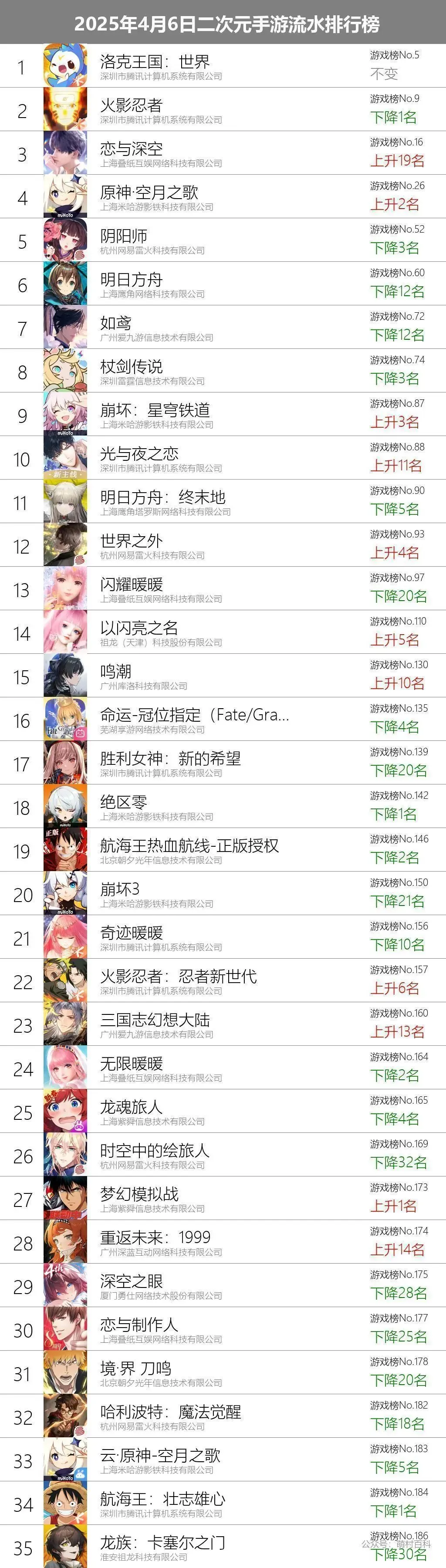 4月6日二次元手游流水排行榜。数据来源于iOS中国区畅销榜数据,数据节点为2026年4月6日22:00。