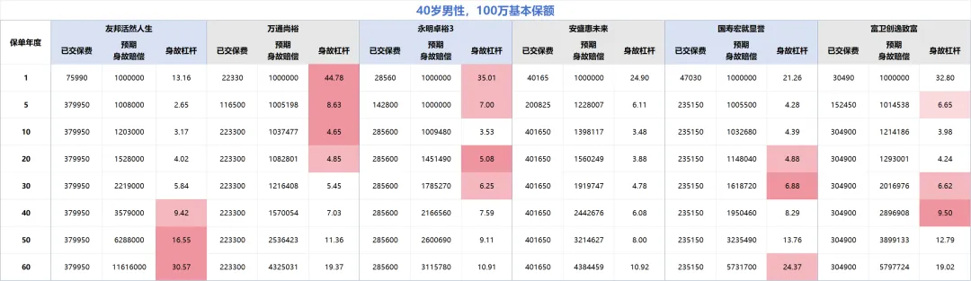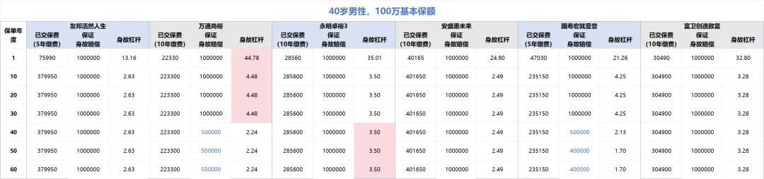 我们以40岁男,总保额100万美金为例,看看哪款产品交的保费最少,杠杆力度最高;
