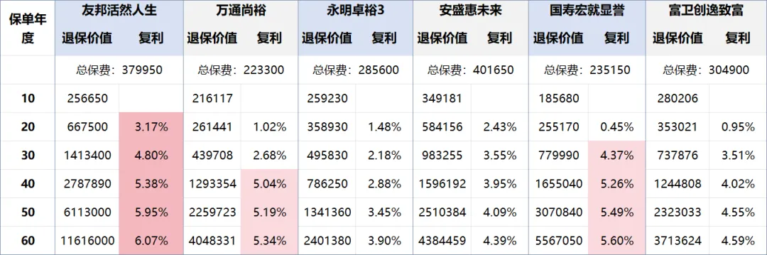 从退保价值来看,友邦活然人生的复利表现是一骑绝尘的,
