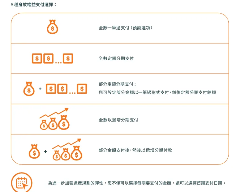 友邦活然人生有,一次性赔付、定额分期赔付、递增分期赔付等6种身故赔偿方式,