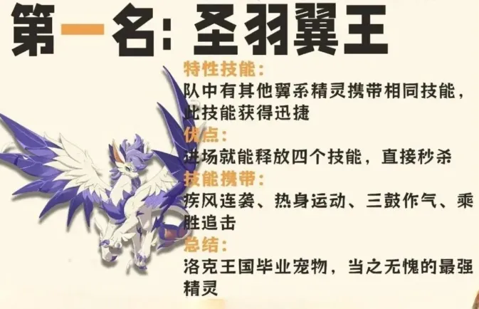 作为翼系精灵王,圣羽翼王是毫无争议的版本天花板。种族值碾压全场,高速、高双攻、高双防,没有任何短板。特性 “飓风” 让它自带迅捷 BUFF,先手权拉满。无论是 PVP 里先手压制、快速清场,还是高级领地试炼、机械城副本攻坚,它都是绝对核心。能打、能扛、能控,一只顶一队,抓到就是血赚,必练 NO.1!