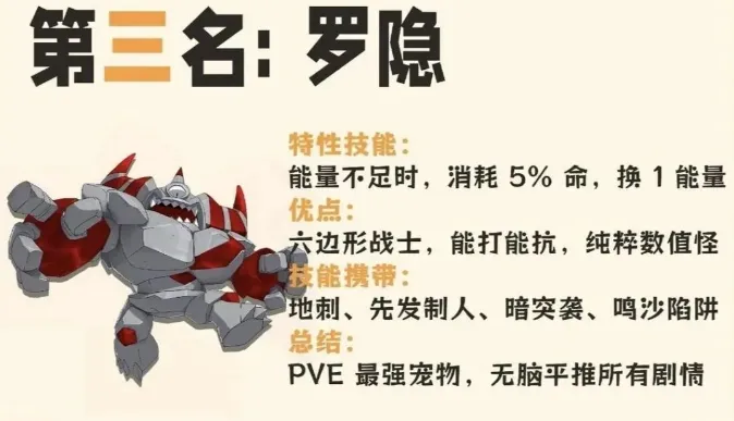 石系 + 恶系的老牌强者,新手零氪福音。物攻种族值全游戏顶尖,一拳破万不是梦。技能 “回击” 后手翻倍,专克高速脆皮;“暗之诅咒” 减防 80%,BOSS 护甲直接清零。特性用血换能量,配合吸血根本不缺输出。拉布朗矿山就能抓,易获取、高回报,开荒、打机械系 BOSS 必备,永远的神。
