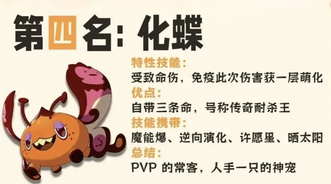 虫 + 萌双属性,最被低估的生存大师。核心特性 “化茧”,受到致命伤害时免疫伤害并锁血,相当于自带两条命。技能 “虫茧” 回血 + 吸血,“捆缚” 挂毒控场。PVP 里骗技能、打乱节奏;PVE 里扛伤害、保队友,容错率极高。多形态颜值还高,可遇不可求,抓到一定要练。