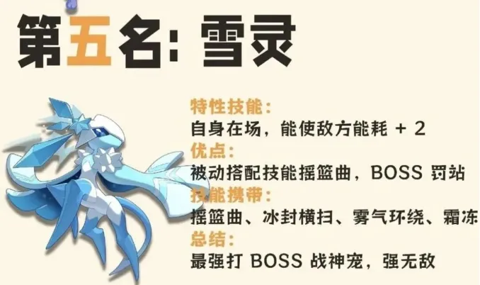 冰系神级辅助,高级副本 “逃课” 必备。特性 “冰封”,只要在场就增加敌方所有技能 2 点能耗,直接卡死对手技能循环。配合 “冰捆缚”“激怒”,能让 BOSS只回能不攻击,实现无伤通关。捕捉简单,雪山地图随处可见。不追求伤害,只为控场,是所有高难副本的最优解。