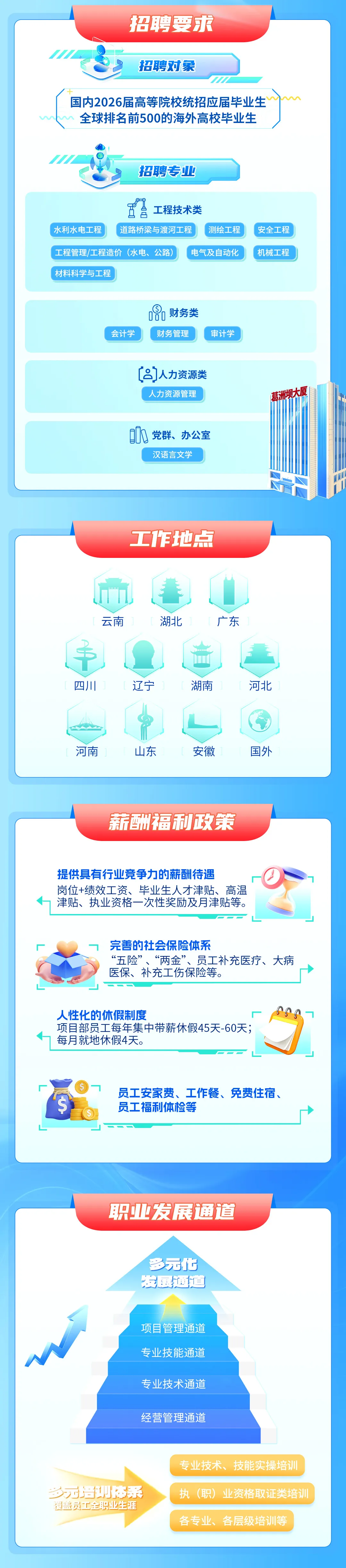 食宿与休假:项目部员工每年集中带薪休假45-60天,每月就地休假4天,部分岗位提供免费食宿。