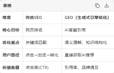 与传统SEO相比,GEO代表着底层逻辑的范式转移: