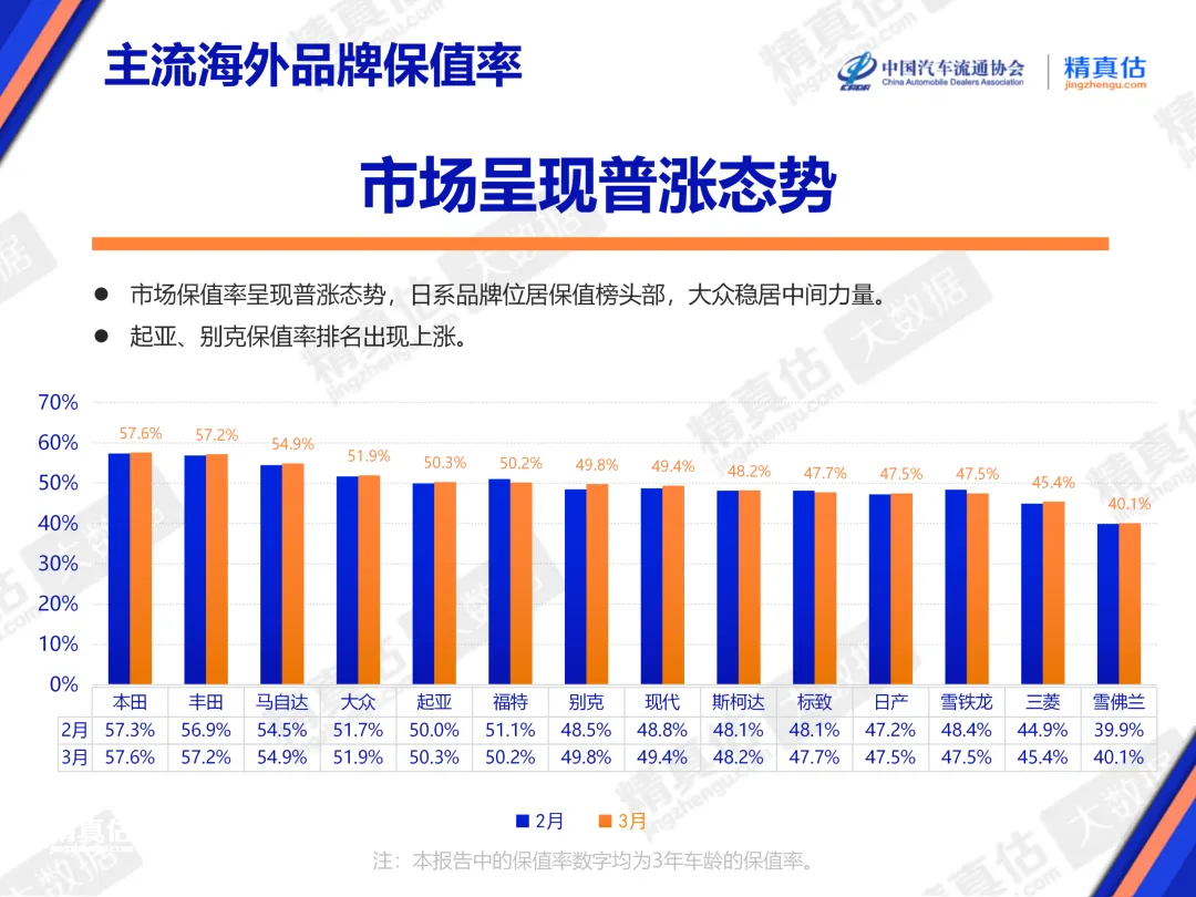 合资品牌中,3月榜单前三名均来自日系品牌,分别为本田、丰田、马自达,三年保值率分别为57.6%、57.2%、54.9%,分别环比增长0.3%、0.3%、0.4%。同为日系品牌的日产汽车和三菱汽车分别排名榜单第十一和第十三名,保值率分别为47.5%和45.4%,分别环比增长0.3%和0.5%。简单来说,3月上榜的五家日系品牌均实现环比增长。
