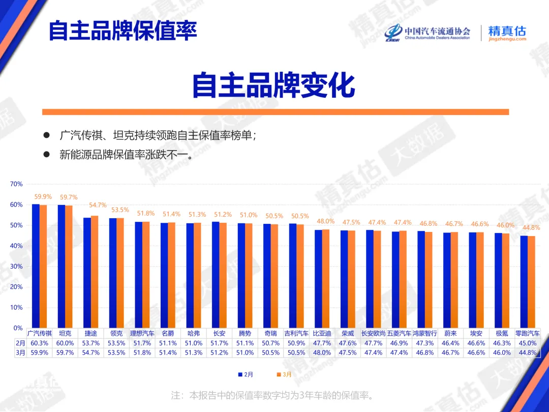 自主品牌方面,3月广汽传祺品牌保值率依然最高,为59.9%,环比下滑0.4%。坦克、捷途两大品牌同样环比下滑,分别下滑0.3%和1.0%,保值率分别为59.7%和54.7%。领克3月保值率与上月保持一致,依然为53.5%。理想汽车、名爵、哈弗、长安、腾势、奇瑞、吉利共7家品牌的三年保值率均达到50%以上,分别为51.8%、51.4%、51.3%、51.2%、51.0%、50.5%、50.5%。其中,理想汽车、名爵、哈弗环比实现增长,分别环比增长0.1%、0.3%、0.3%。除上述品牌之外,包括比亚迪、荣威、长安欧尚、五菱汽车、鸿蒙智行、蔚来、埃安、极氪、零跑汽车也均进入榜单,三年保值率分别为48.0%、47.5%、47.4%、47.4%、46.8%、46.7%、46.6%、46.0%、44.8%。