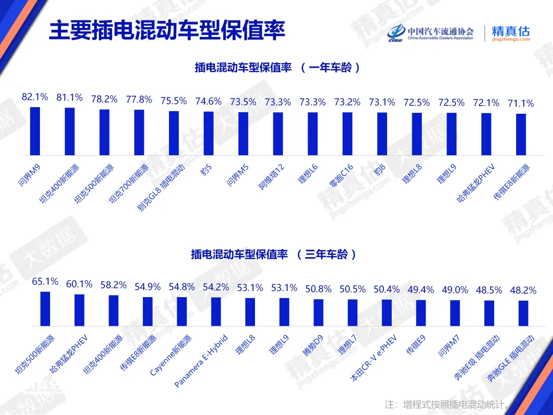 具体车型中,在插电混动车型榜单中,插电混动车型一年保值率前三名分别为问界M9、坦克400新能源、坦克500新能源,保值率分别为82.1%、81.1%、78.2%;三年保值率前三名车型分别为坦克500新能源、哈弗猛龙PHEV、坦克400新能源,保值率分别为65.1%、60.1%、58.2%。