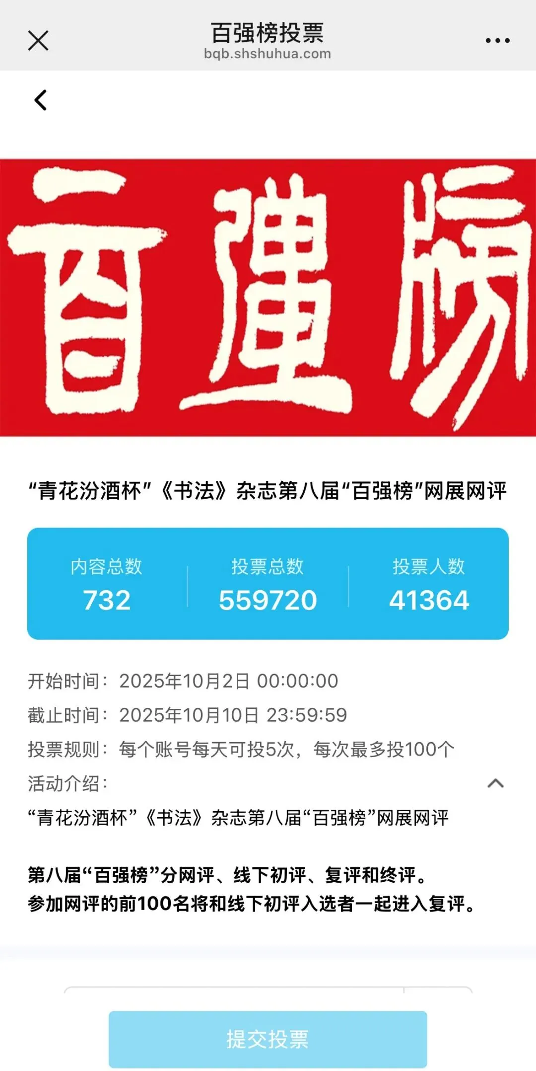 “青花汾酒杯”第八届中国书坛中青年“百强榜”网络评选活动现已结束。此次网络评选,共有41364人次参与投票,总计投出559720票。