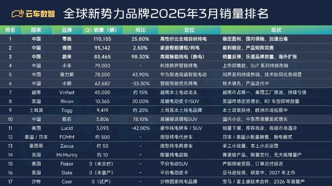 Rivian是美国高端电动皮卡/SUV新势力代表,2026年Q1销量10365辆,同比增长20.0%,市值约1080亿人民币(150亿美元),是美国新势力的第一梯队品牌。(🇺🇸美国2026年3月汽车品牌销量排行榜)