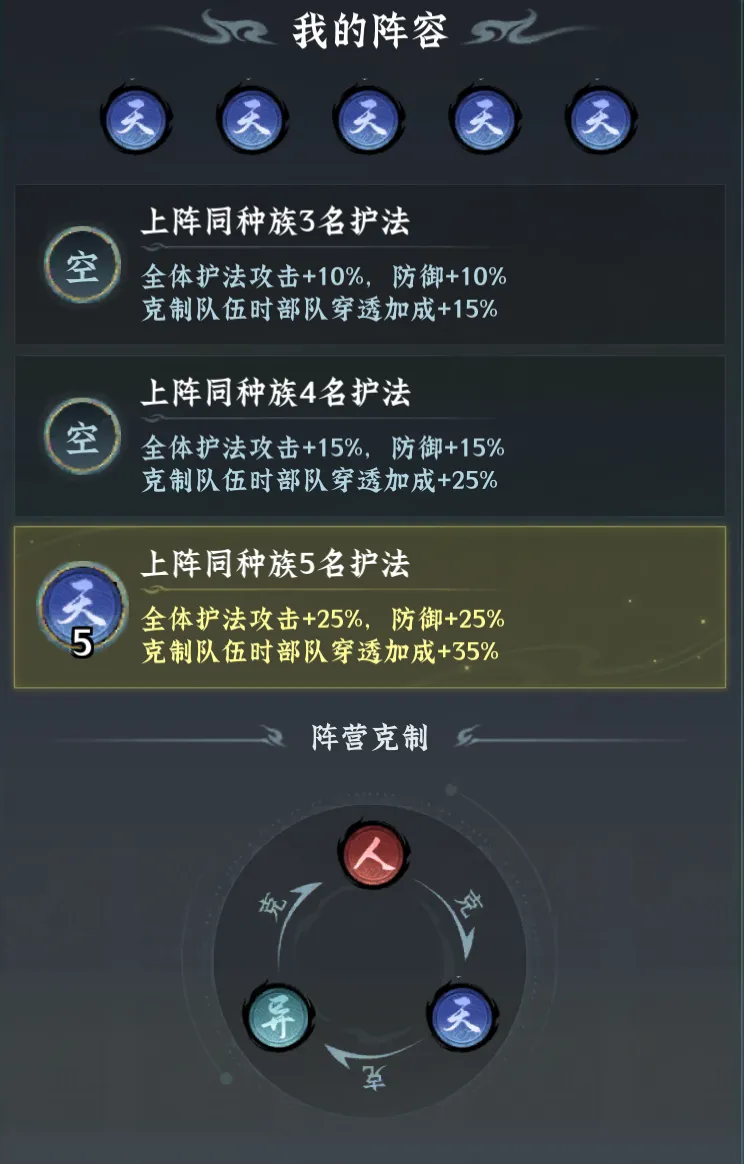 上阵一定数量同种族护法会获得种族羁绊加成,大幅提升队伍整体实力。另外,护法种族遵循天克异、异克人、人克天的循环克制关系,上阵克制敌人的种族也会获得大量加成。