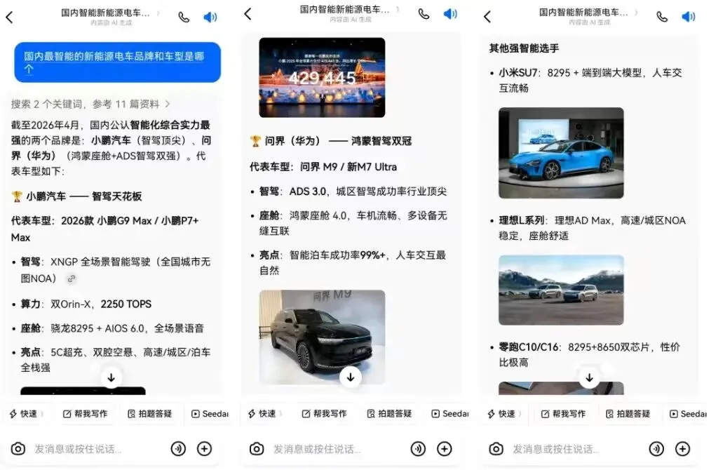 例如,用户查询“国内最智能的新能源电车品牌和车型”,AI回应中提到“小鹏汽车,智驾天花板”,这正是GEO的价值:将品牌嵌入用户决策链条,直接建立信任,实现从“被动搜索”到“主动推荐”的跃升。(截图来自豆包,仅作演示用途)