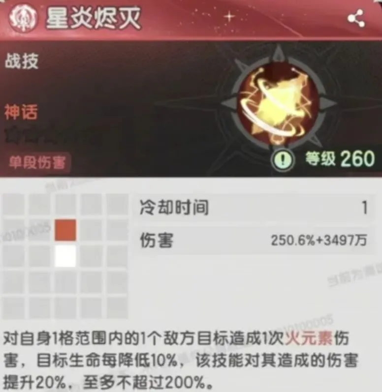 星炎烬灭:对面前敌人造成伤害,敌方血量越低伤害越高,低血时能高频高额输出,评级小顶级。