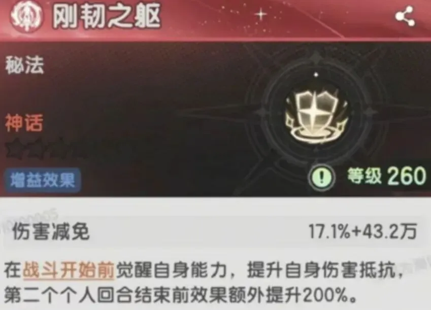 刚韧之躯:战斗开始提升自身伤害抵抗,第二个个人回合结束前效果额外提升,是PVP神技但格子有限,评级人上人。