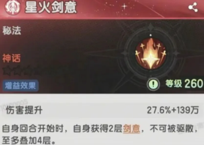 星火剑意:回合开始获得不可驱散的增伤BUFF,可与浴血狂燃等增伤BUFF叠加,评级夯。