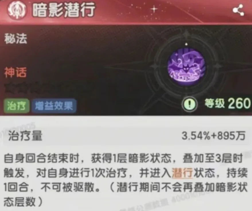 暗影潜行:回合结束获1层暗影,叠满后治疗并进入潜行状态,是PVP神技,评级顶级。