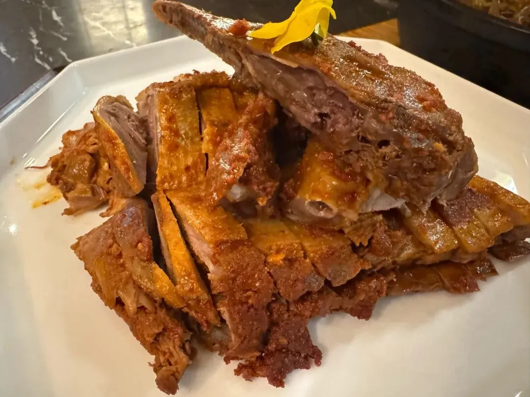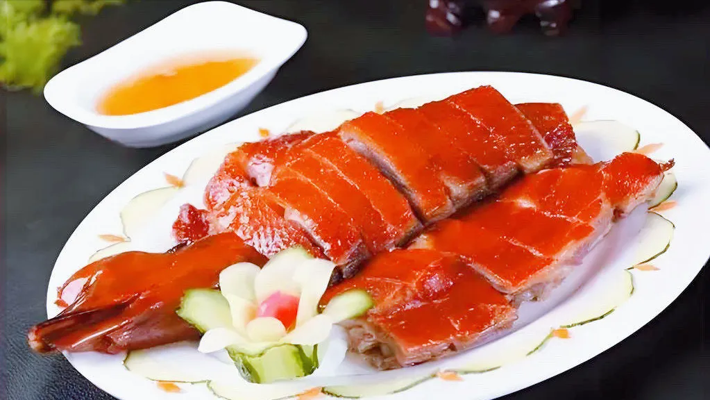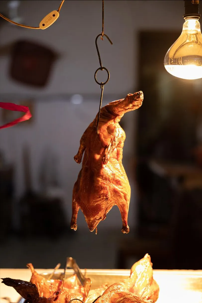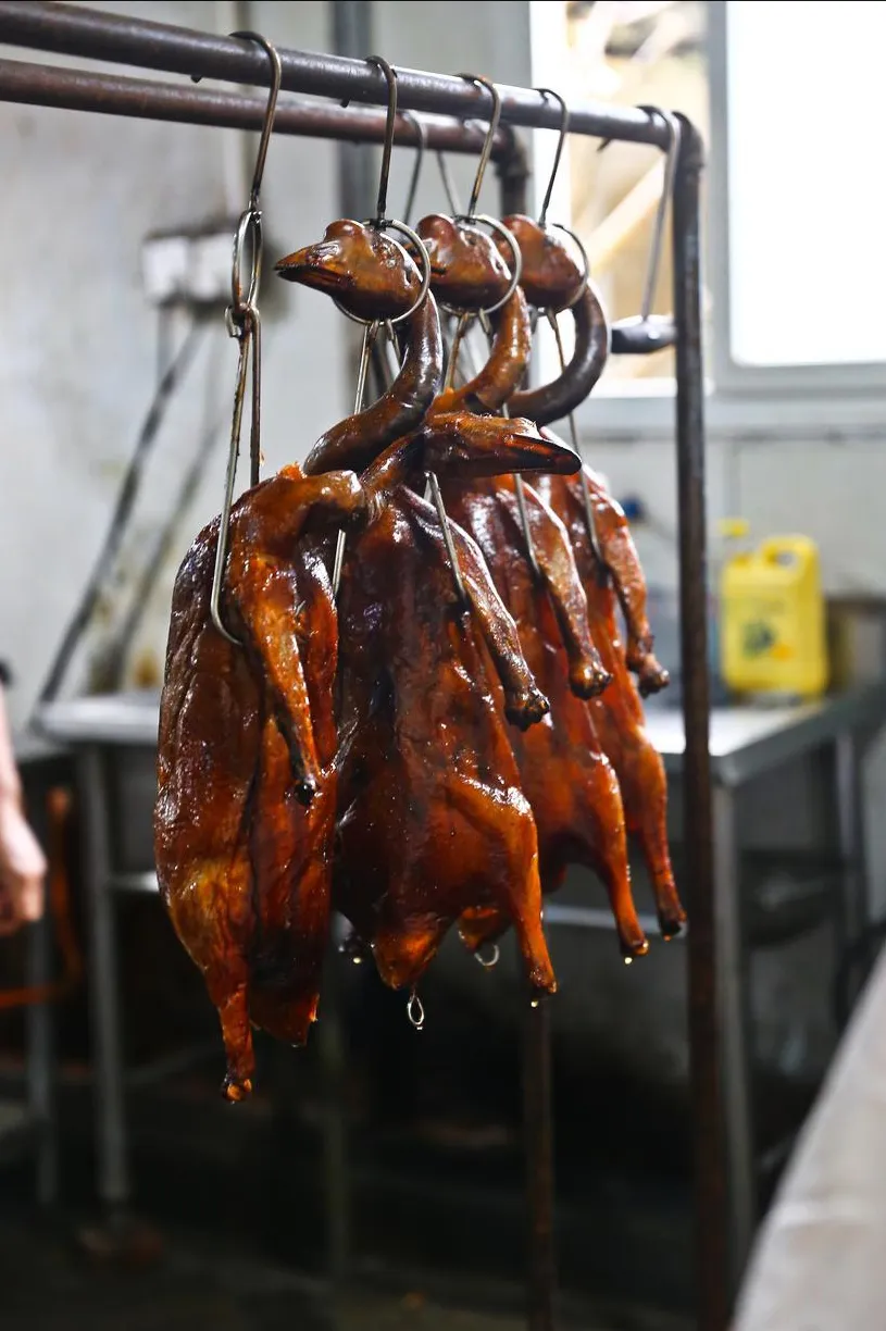 刚出炉的鹅,皮色红亮,咬一口“咔嚓”响,肉汁顺着嘴角流,肥而不腻。蘸点酸梅酱,那是画龙点睛。