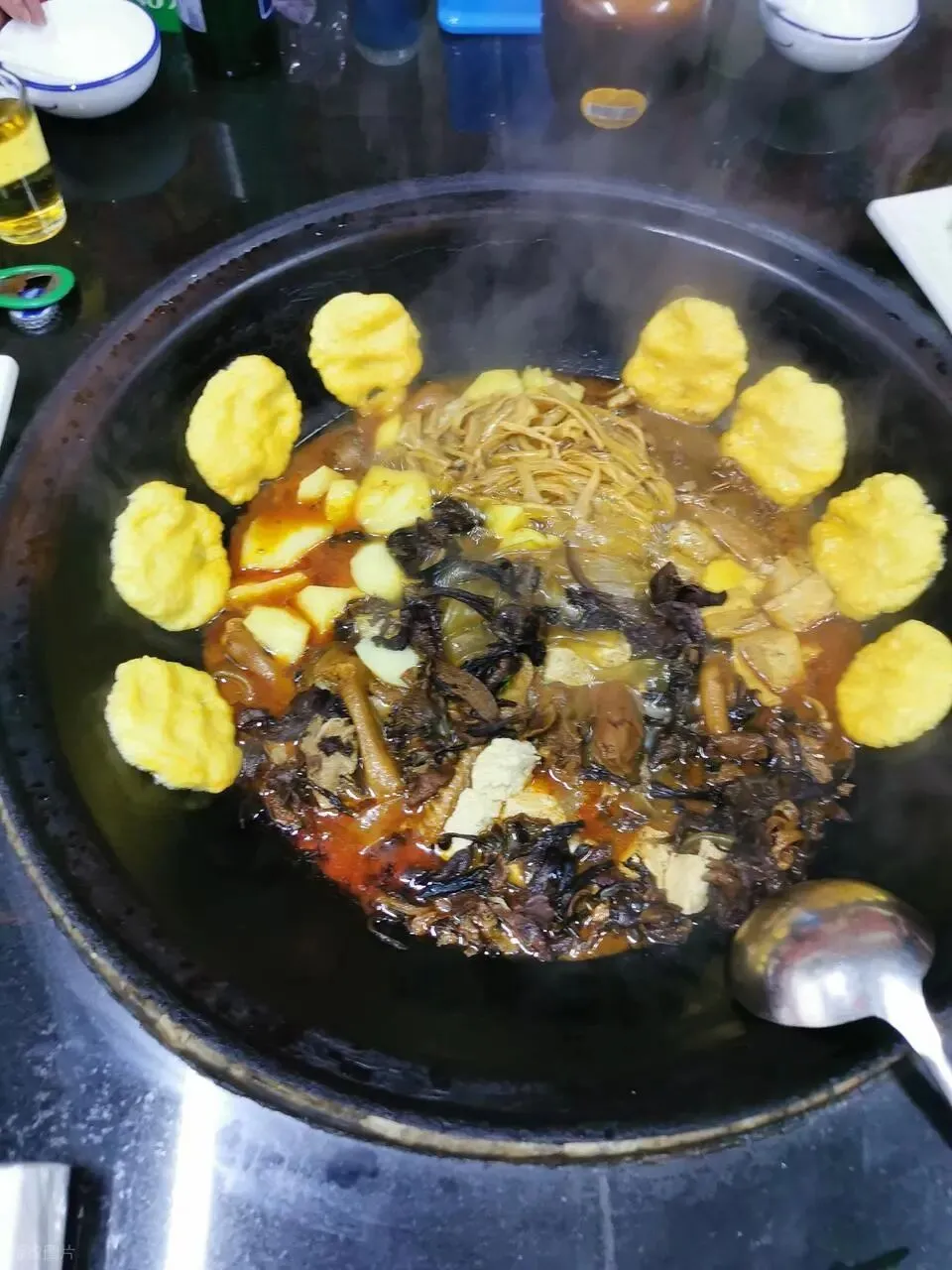 往里扔土豆、粉条、大白菜,尤其是贴锅边那圈玉米面饼子,蘸着汤汁吃,绝了!