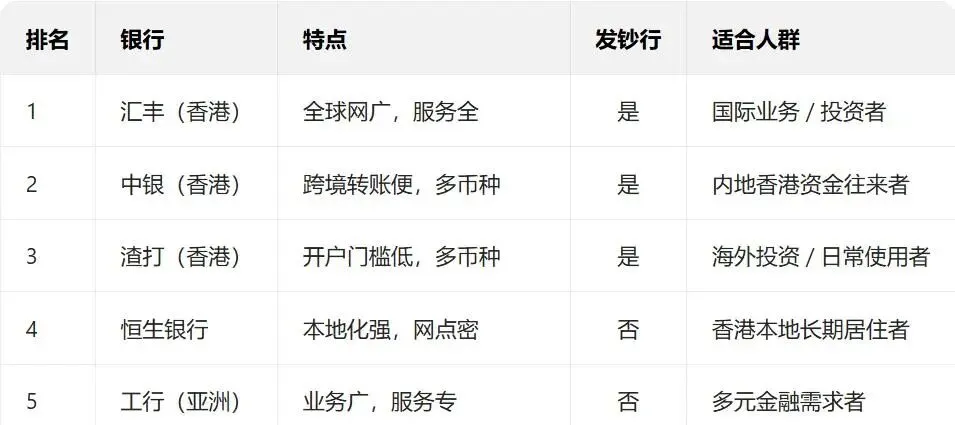 选择银行就像选择旅行伙伴,取决于你要去哪里以及如何旅行。如果你需要广泛的国际金融服务,汇丰银行可能更适合你;如果你更关注高效的数字产品和服务,渣打银行值得考虑;如果经常进行香港内地转账,中银香港是很好的选择。