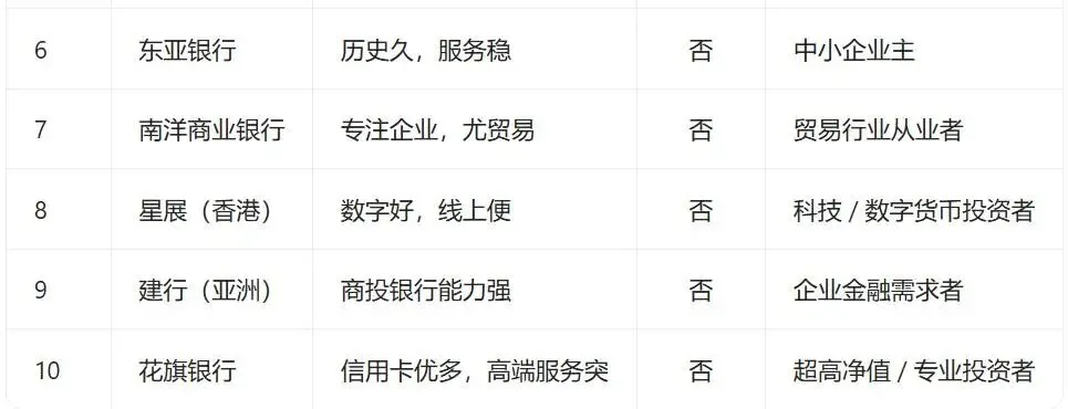 2025年香港十大银行排名及特点: