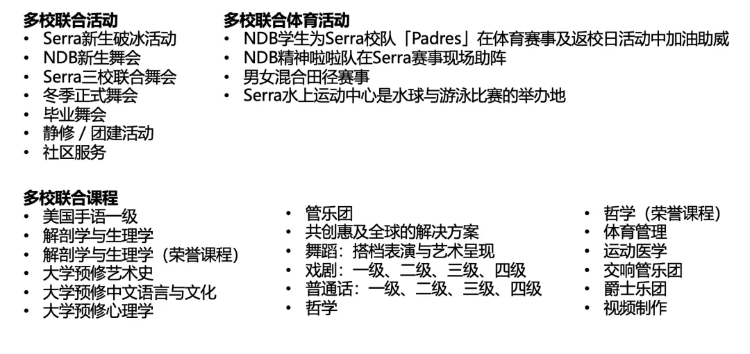 毕业顶点项目十一年级学生围绕社会公正议题,开展深度调研与学术分析,并结合本校教育理念与天主教教义进行神学反思。STEM 项目:双课时 AP 实验科学区别于常规课程,NDB 的 AP 化学与生物完整覆盖大学全年内容。每日双课时保障了充足的实验时间与深度探究,让学生在大学STEM 课程中具备显著优势。“赋能成功计划”(EFS项目)为有正式诊断的学生提供四年制个性化支持,培养自我倡导与决策能力。学生在享受合理适配支持的同时,需达到同侪标准,广泛参与荣誉及 AP 课程。